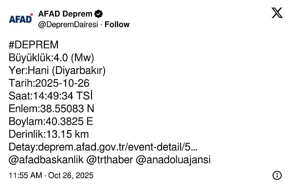 AFAD tarafından yapılan açıklamaya göre, Diyarbakır’ın Hani ilçesinde meydana gelen deprem hakkında detaylı bilgilere ulaşabilirsiniz: