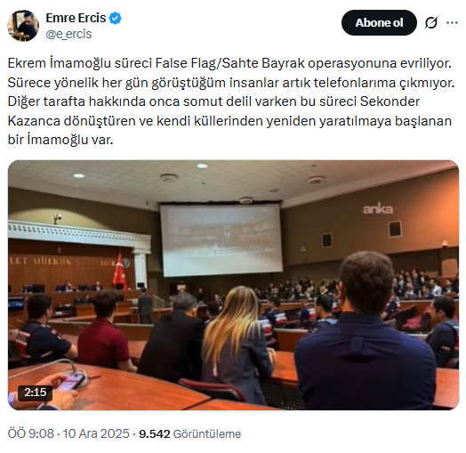 Ses kaydını RT yapanların dahi gözaltına alındıklarını sosyal medya hesaplarından duyurmasının ardından AKP trolü olarak bilinen Emre Erciş de bu sabah İmamoğlu’nun bir duruşmadaki ses kaydını paylaştı.