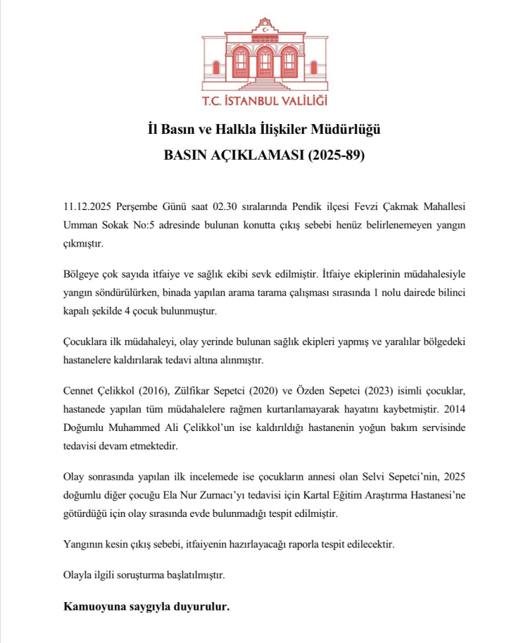 Valilik açıklamasında, çocukların annesi Selvi Sepetci’nin olay sırasında 2025 doğumlu çocuğu Ela Nur Zurnacı’yı tedavi için hastaneye götürdüğü ve evde bulunmadığı belirtildi. Yangının kesin çıkış sebebinin, itfaiyenin hazırlayacağı raporla belirleneceği ifade edildi.