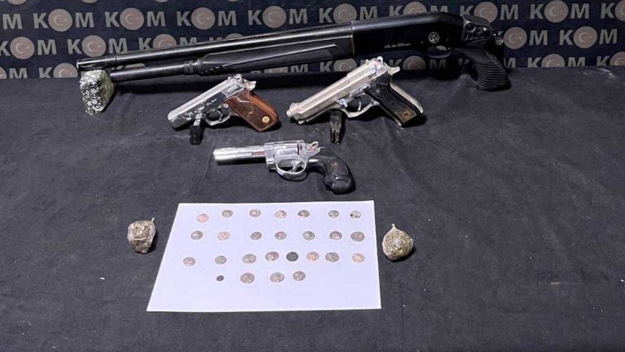 Elde edilen bilgiler doğrultusunda düzenlenen operasyonda Y.Y.Ö. ile B.Ö. gözaltına alındı. Kargoya teslim edilen paket ve adreslerinde yapılan aramada Helenistik döneme ait olduğu belirtilen 26 gümüş sikke, 3 kurusıkı tabanca, 2 şarjör, 1 pompalı tüfek ve 6 gram esrar ele geçirildi.