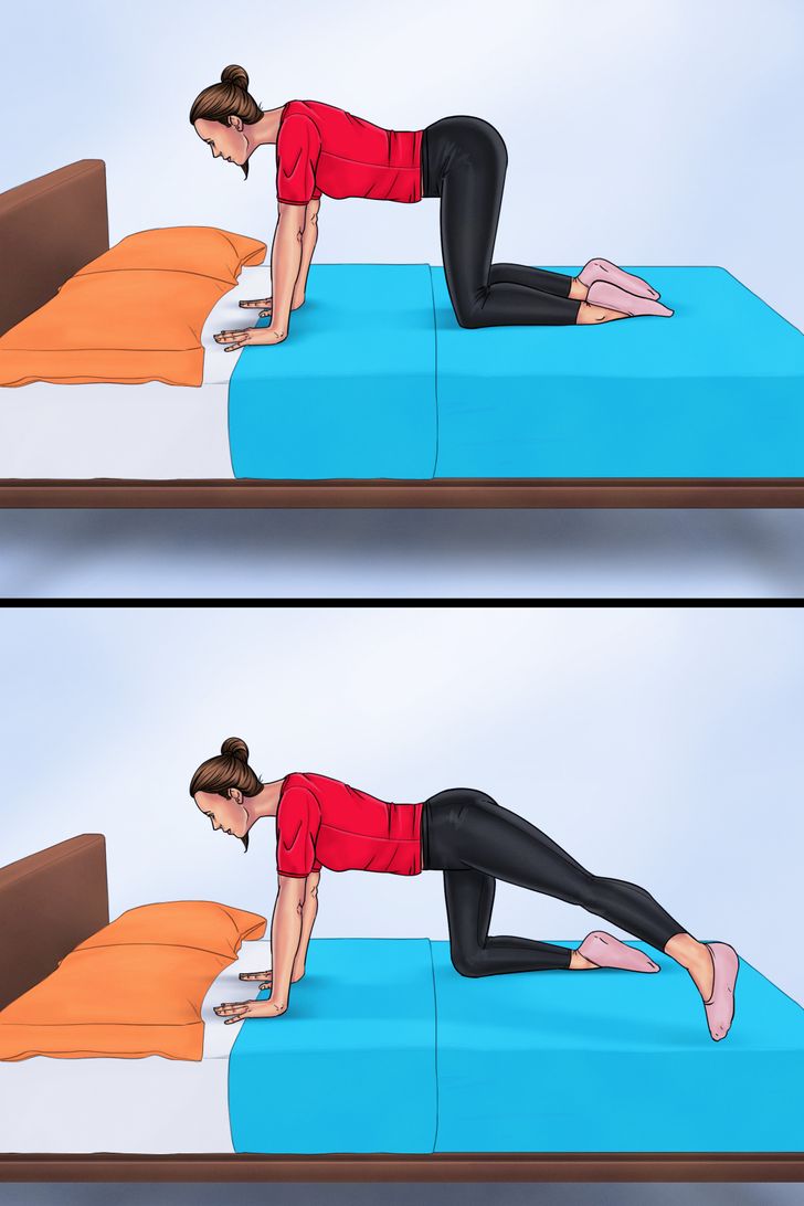 Dört ayak üzerinde durun. Bilekler omuz hizasında, dizler kalça genişliğinde açık olmalı. Bacak yana kadar yukarı kaldırın ve hafifçe bir tekme atın, başlangıç pozisyonuna dönün. Aynı hareketi diğer bacak için de tekrarlayın.